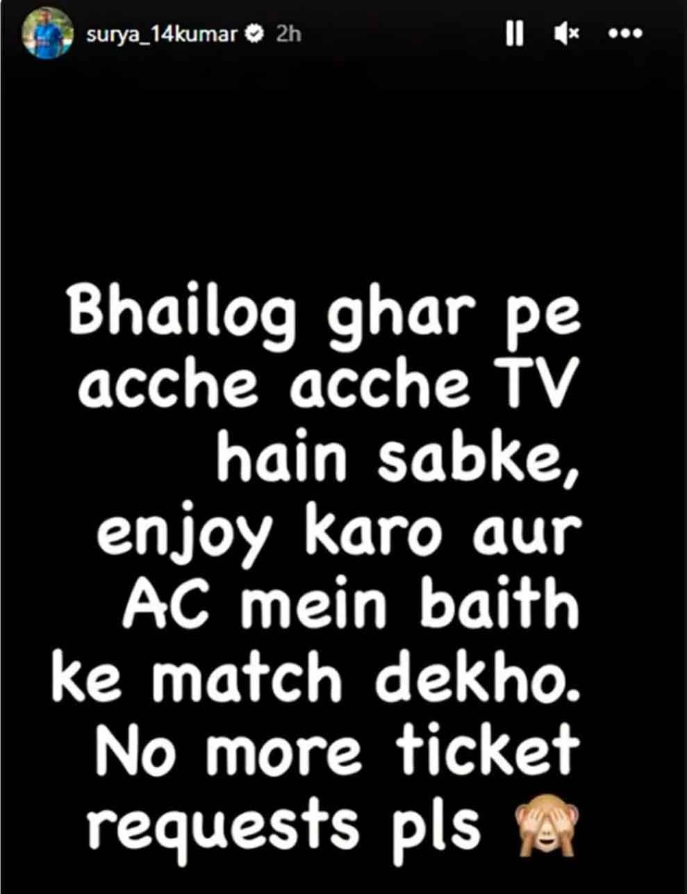 سوریا کمار یادیو نے سوشل میڈیا پر جاری پیغام میں کہا بھائی لوگ! گھر میں اچھے اچھے ٹی وی ہیں سب کے، انجوائے کرو اور اے سی میں بیٹھ کر میچ دیکھو، ٹکٹوں کی درخواست اب اور نہیں پلیز